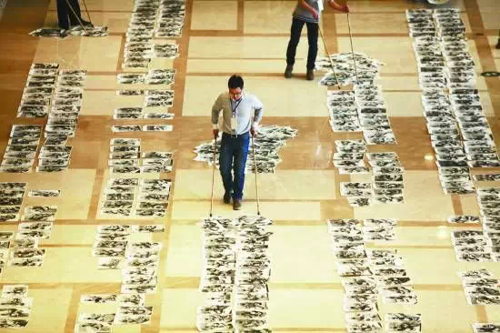 1月12日,陕西省西安市,位于某宾馆的2015年陕西省普通高考美术类专业考试阅卷现场,1000多平方米的大厅内摆满美术作品,6位评委老师在评卷现场推敲评点试卷。CFP供图